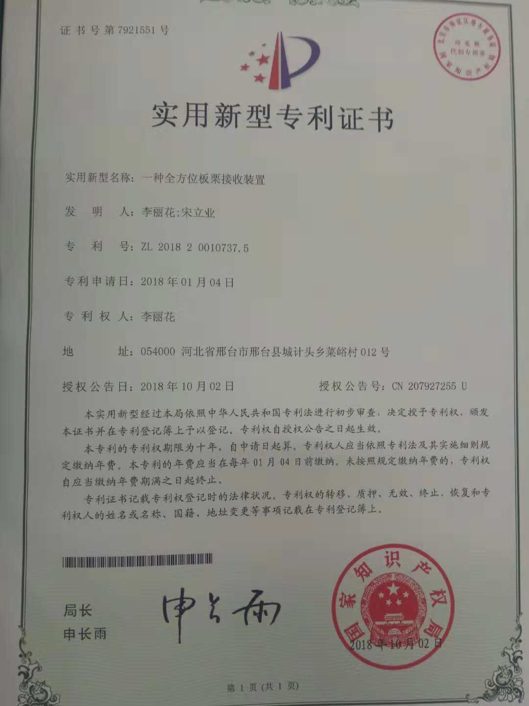 该项专利从问题的提出、对农户意见的收集整理、思考设计、绘制图纸直至完善改进等过程,历经了4个月的研发阶段。最终研究设计出《一种全方位板栗接收器》。