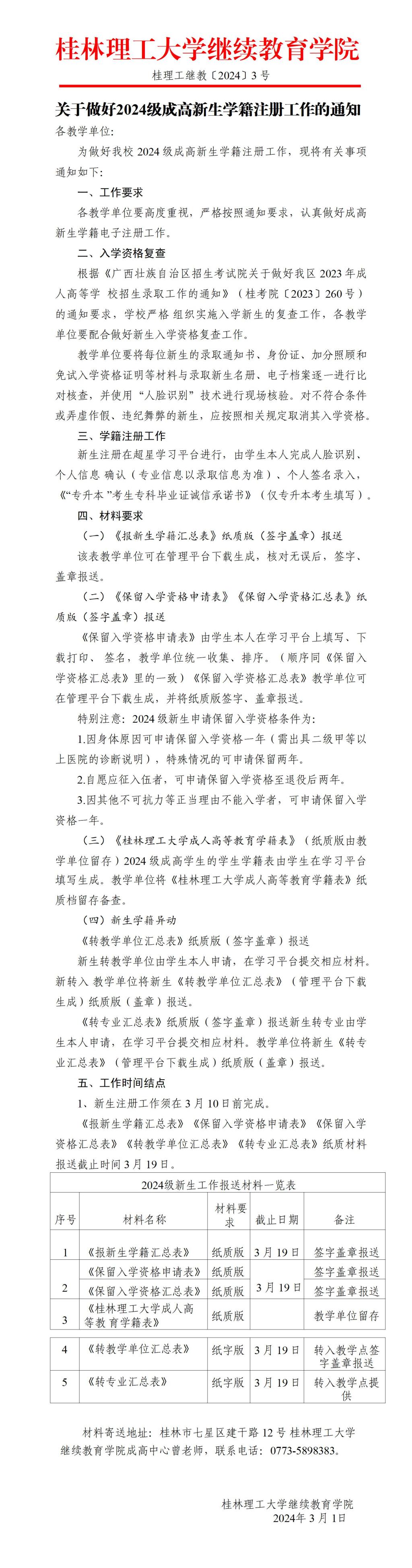 关于做好2024级成高新生学籍注册工作的通知 发布者:成高管理中心 2024-03-01 已阅人次 (一审:曾婕 二审:段伟才 三审:李衡) 上一条:bb贝博官网关于对第二批超过最长学习年限的成人高等教育学生拟作退学处理的公示 下一条:bb贝博官网关于对超过最长学习年限的成人高等教育学生拟作退学处理的公示 关注我们